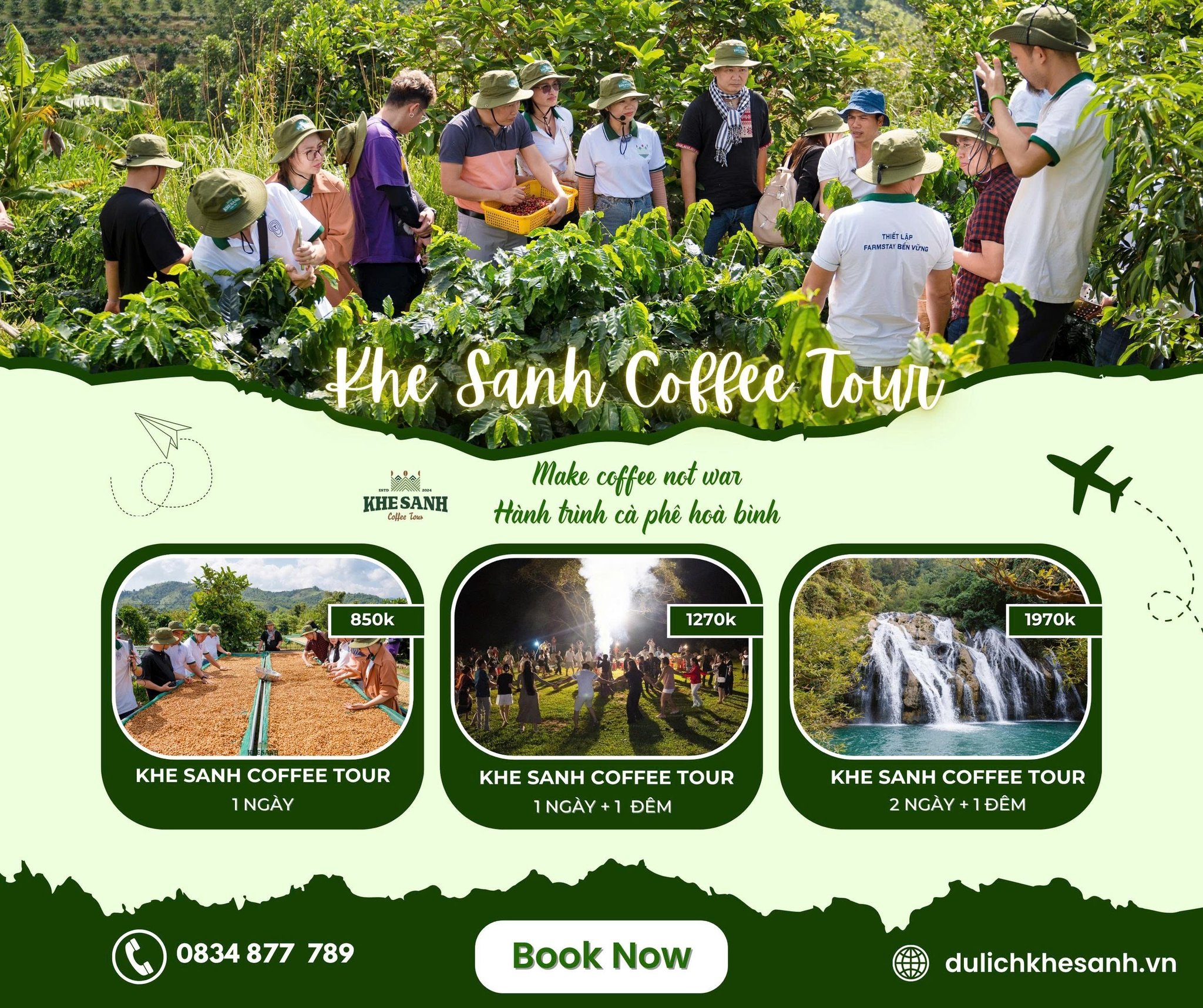 Khe Sanh Coffee tour là hành trình khám phá trải nghiệm cà phê đặc sản và những bí ẩn của vùng đất Khe Sanh. Khe Sanh Coffee tour có 3 lựa chọn cho bạn: -Khe Sanh Coffee tour khám phá với thời gian 1 buổi. -Khe Sanh Coffee tour trải nghiệm với thời gian 1 ngày. -Khe Sanh Coffee tour hành trình 2 ngày 1 đêm. Bạn sẽ tự tay thu hoạch đến rang xay, tự tay pha chế tách cà phê đậm đà mang dấu ấn cá nhân. Trên từng bước chân của bạn, những câu chuyện thú vị về cà phê thơm ngát, những trang sử hào hùng và nền văn hóa độc đáo của vùng đất này sẽ dần được hé mở. Trải nghiệm không chỉ là du lịch mà là khoảnh khắc bạn chăm sóc chính mình, tìm lại sự cân bằng và niềm vui qua thiên nhiên và văn hóa tuyệt đẹp.